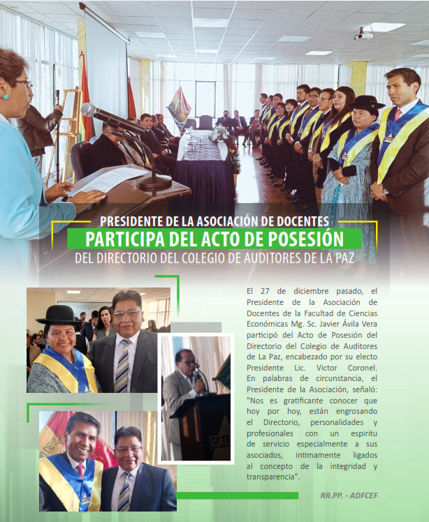 La Paz, 6 de diciembre de 2024 - En presencia de las Máximas Autoridades de la Facultad de Ciencias Económicas y Financieras - FCEF Mg. Sc. Boris Quevedo Calderón - Decano y Mg. Sc. Edgar Rojas Velásquez - Vicedecano e invitados especiales, como el Lic. Antonio Fernández Céspedes - Ex Decano, Mg. Sc. Ramiro Mendoza Caceres - Jefe de Departamento de Contabilidad de la Universidad Mayor de San Andres - UMSA, Lic. Pablo Ledezma Brañez - Docente, además de los miembros del Directorio Lic. Demetrio Ancalle Choque y el Mg. Sc. Wilfredo Matias Poma, el Presidente de la Asociación de Docentes Mg. Sc. Javier Avila Vera, inicio el acto protocolar de entrega oficial de la página web y el repintado de la oficina del ente gremial, este último ubicado en la planta baja del Monoblock Central de la UMSA.